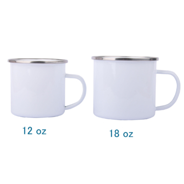 Robuste Emailletasse in zwei Größen (klein 12 oz = 350 ml oder groß 18 oz = 530 ml) mit silbernen Tassenrand
